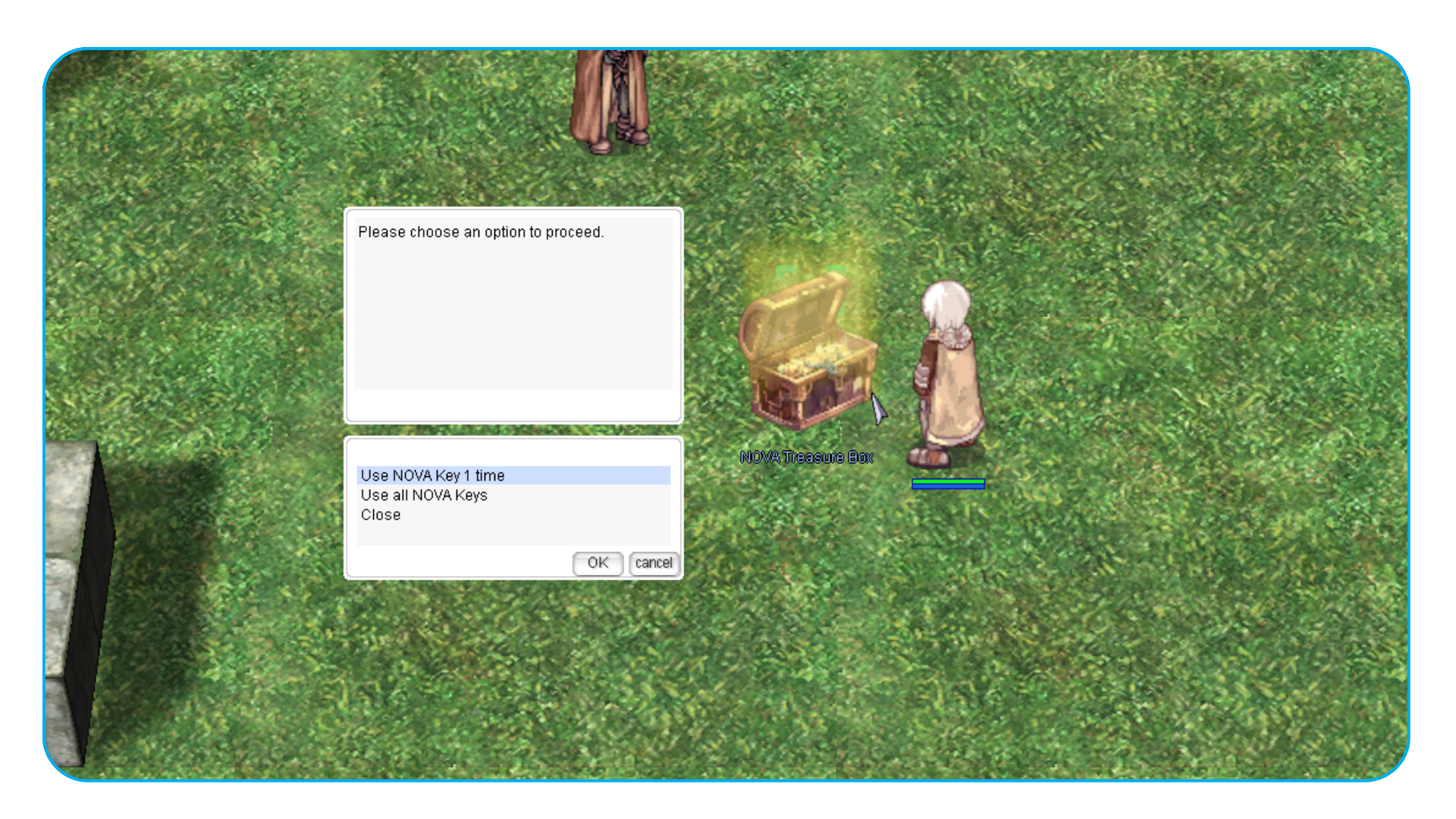 Você pode criar uma instância solo do Tesouro NOVA pelo menu do NPC. A instância utiliza o mapa poring_w01.