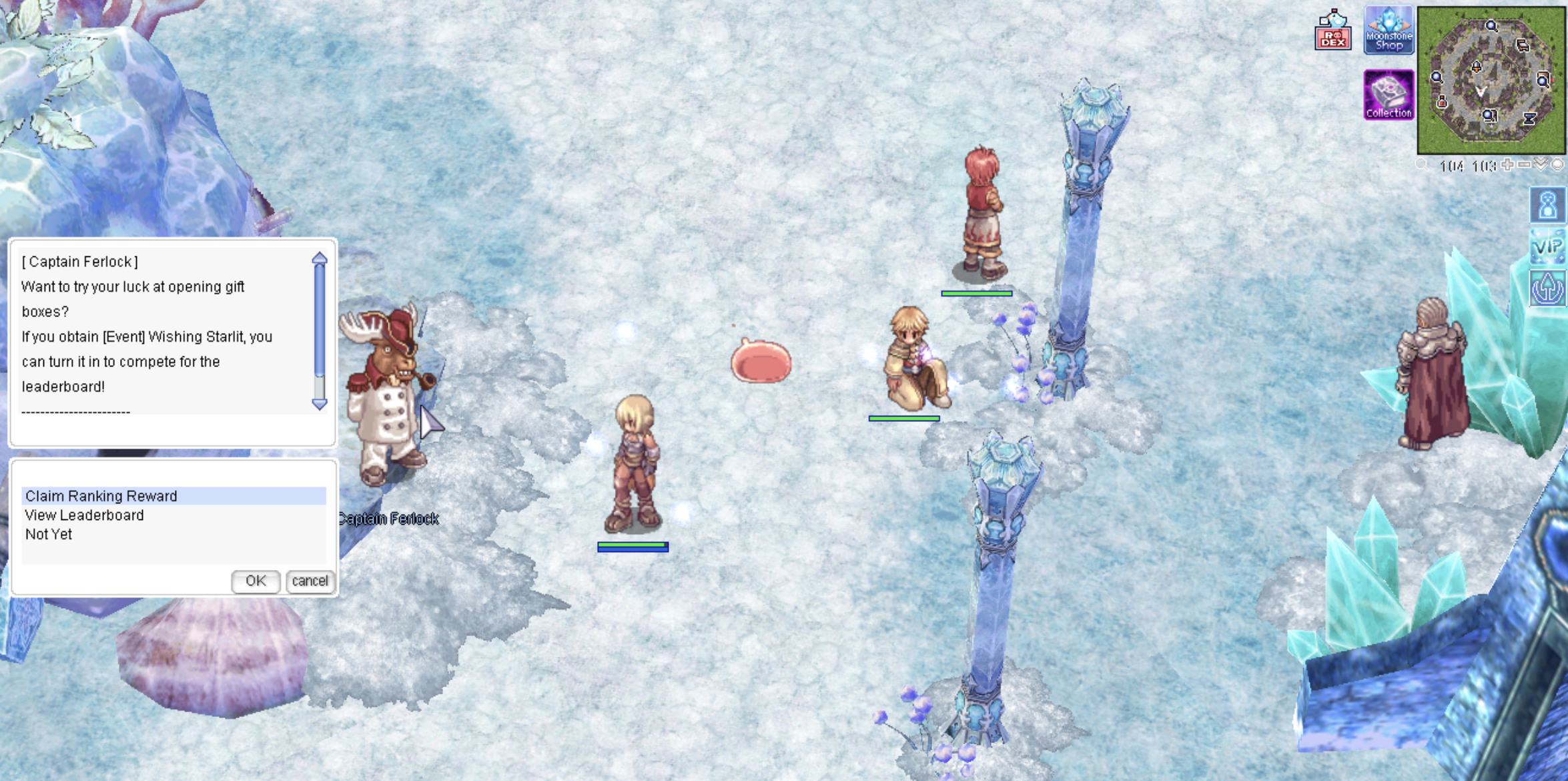 Christmas Ranking Event Rewards NPCPlayer now can received the rewards of this event at NPC Captain Ferlock (coordinates Geffen 104,103)