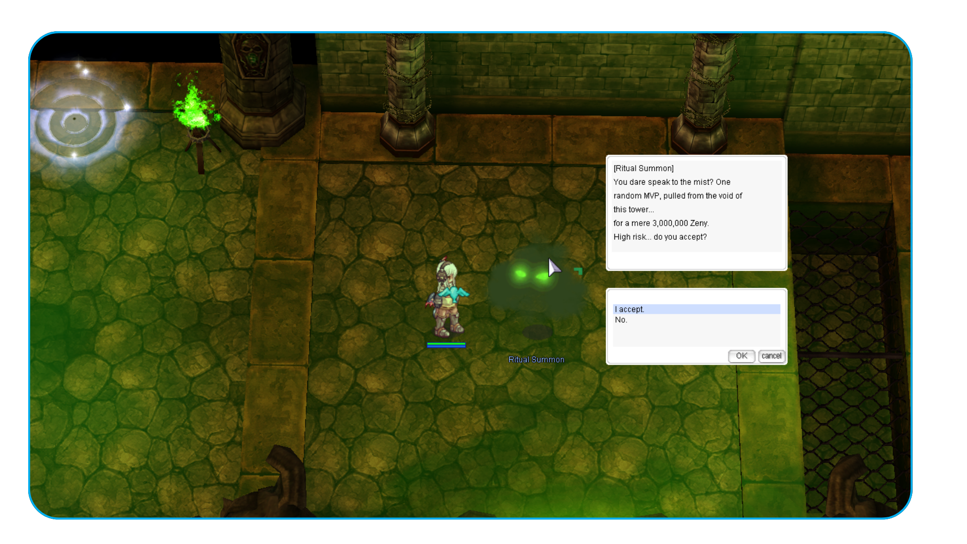 • Se confirmado e o líder do grupo tiver Zeny suficiente, o NPC desaparece e o MVP aparece após 5 segundos.